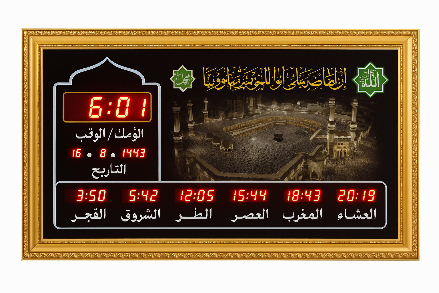 Se näyttää tarkat rukousajat, päivämäärän ja helpottaa arkea uskon kanssa. Tyylikäs kehys ja selkeä LED-näyttö tekevät siitä täydellisen lisän kotiin tai moskeijaan. Elä joka hetki oikeaan aikaan.