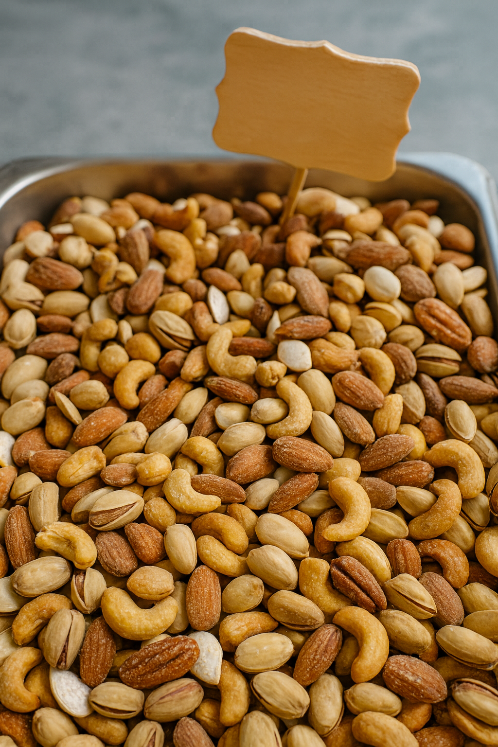 Cashewpähkinät, mantelit, pistaasit, auringonkukansiemenet, kurpitsansiemenet, pekaanipähkinät, maapähkinät, suola