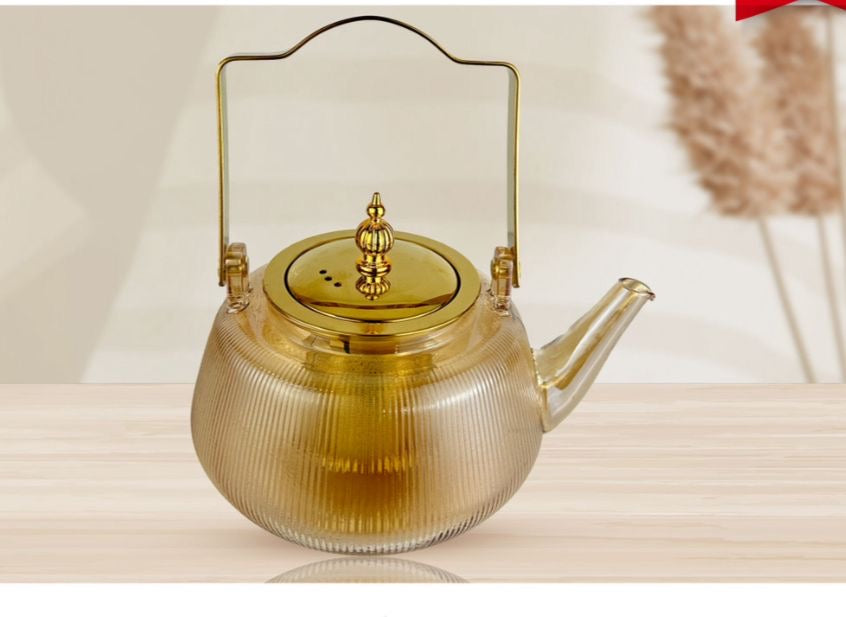 Nauti teestä tyylillä – lasinen teekannu yläkahvalla ja kultaisilla yksityiskohdilla tekee jokaisesta teehetkestä arvokkaan. Kätevä kantaa, kaunis katsella.